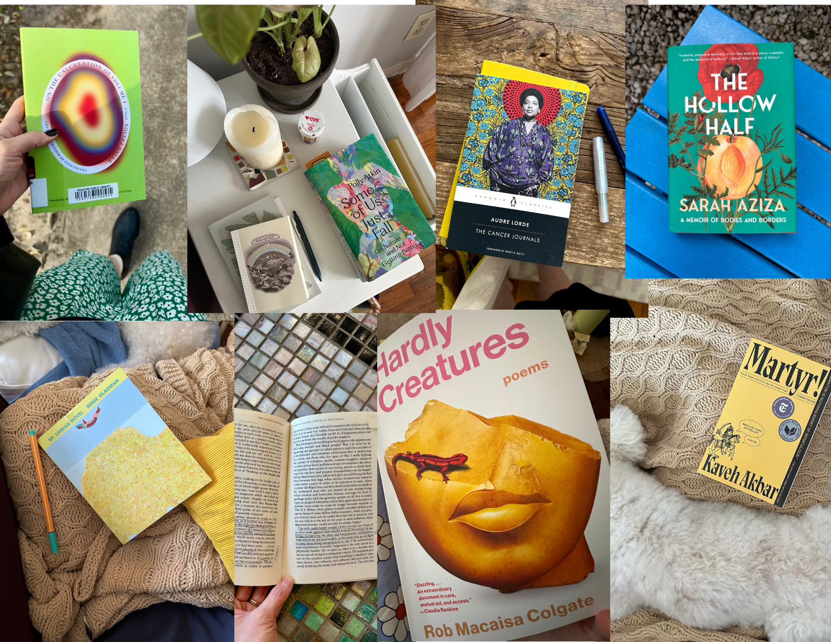 Stillness, sitting, resting, care, and deep listening carried me through this year’s reading. From a memoir about bodies and borders, to another memoir about chronic illness, nature, and not getting better. A poetry collection as an accessibility museum. To a classic feminist thinker on breast cancer. Into fiction that sat with discomfort, allowing both narrators and the reader to question and seek answers from within. Where repetition, death, and obsession hold us back while trying to pull us forward. Writers play with fantastical narrative structures, revealing themselves through their creative projects.